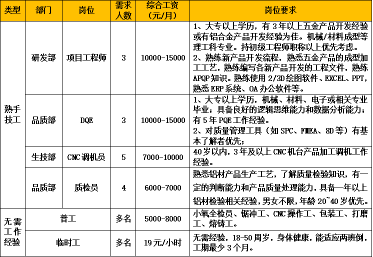 公司擁有廣東省唯一的鋁車體工程技術研究中心。“鈦美鋁材”品牌先后獲得鋁型材行業(yè)內的最高榮譽:“中國馳名商標”、“中國著名品牌”、“中國名優(yōu)產品”;公司榮獲“國家高新技術企業(yè)”、廣東省“專精特新”企業(yè)等榮譽稱號。因生產發(fā)展需要,誠聘以下崗位: